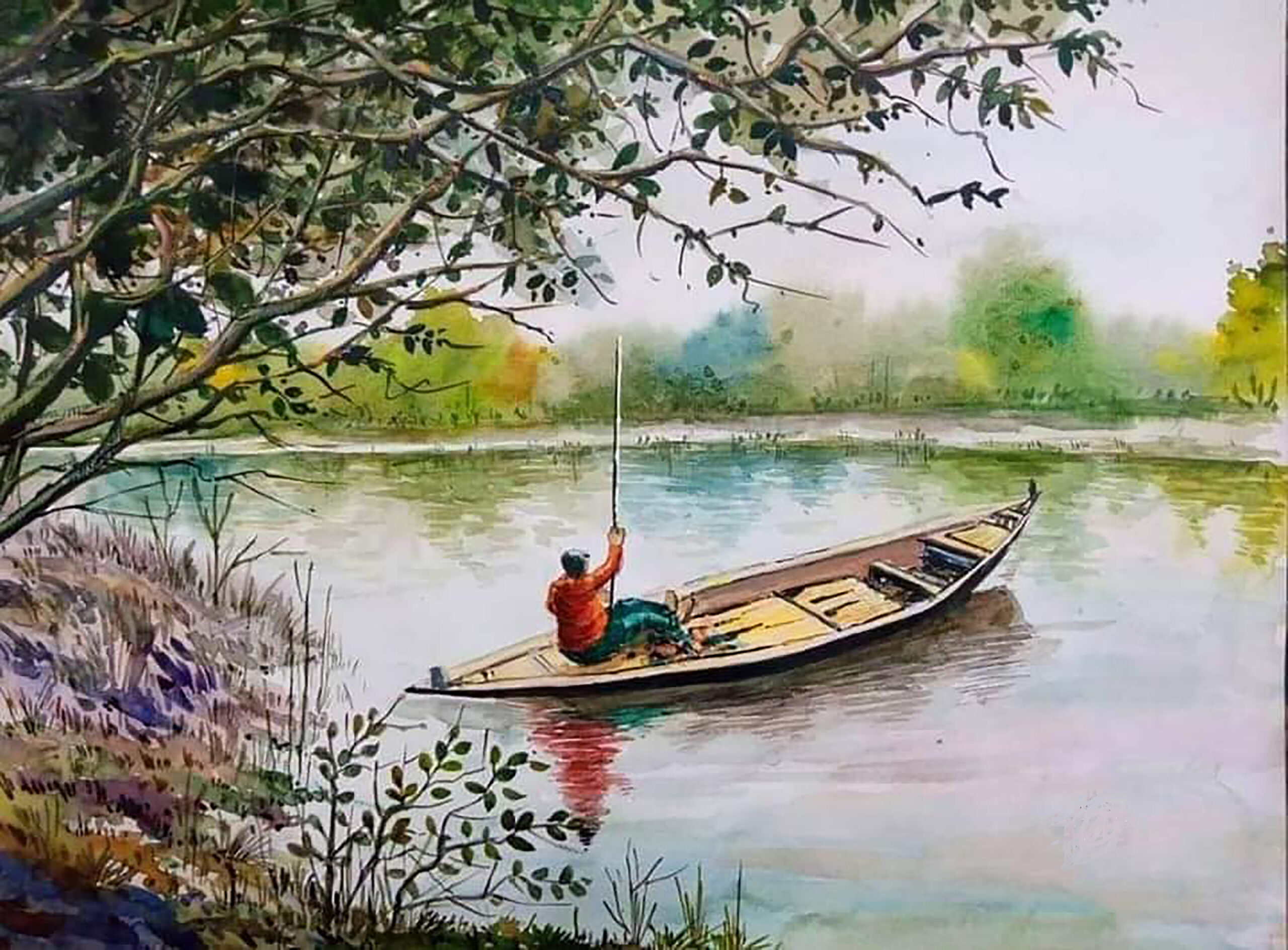 The composition beautifully captures scenes of rivers, trees, open fields, and traditional landscapes, brought to life through delicate hand-drawn techniques. The artistic style adds authenticity and warmth, making the artwork feel personal and expressive. It evokes a sense of peace, grounding, and connection with nature—ideal for those who appreciate eco-inspired and culturally rich art.