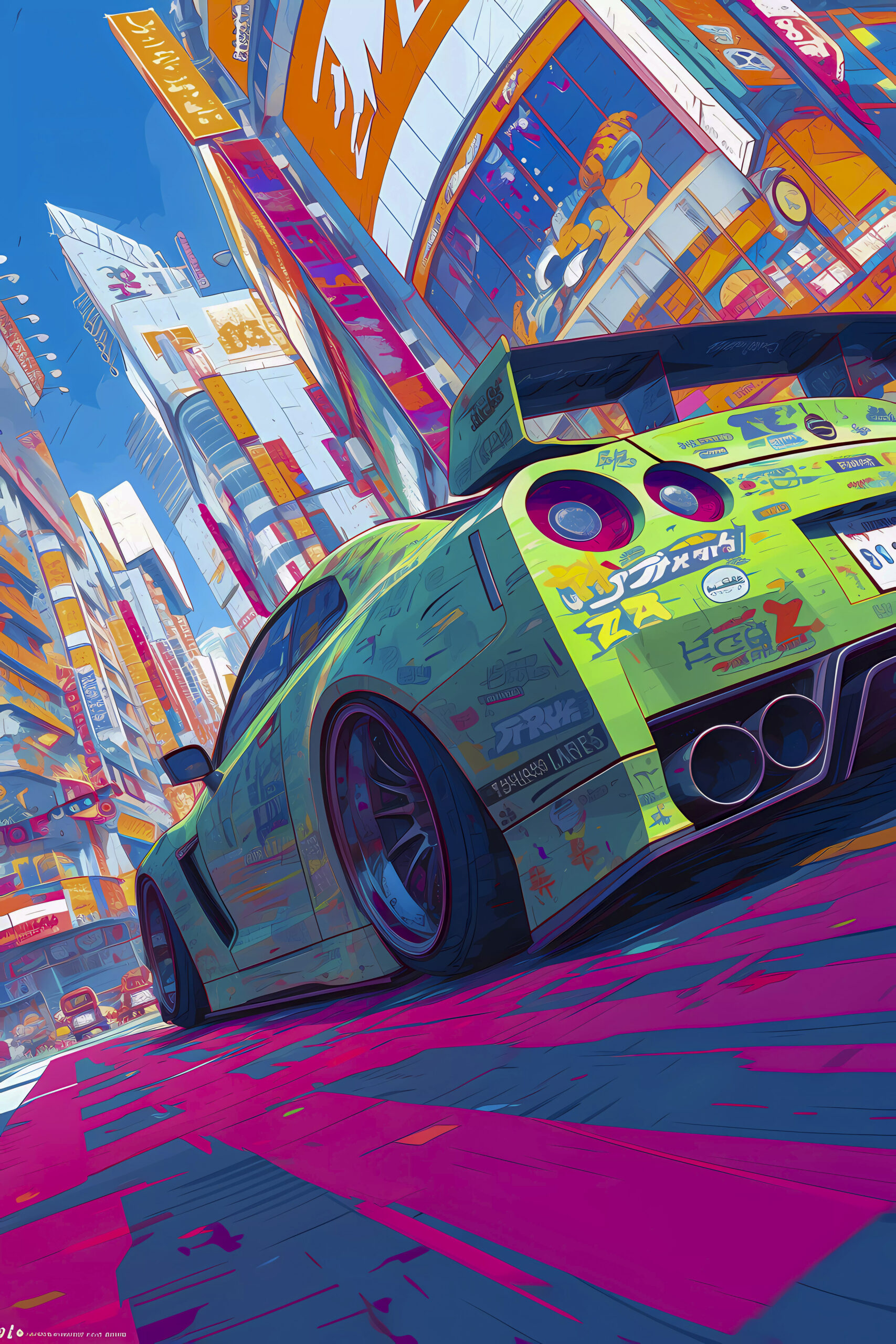 Inspired by the vibrant street racing scenes often portrayed in Initial D, the composition features a modified sports car brought to life with dynamic lines, neon accents, and abstract elements that evoke speed and motion. The anime influence adds character and intensity, blending futuristic visuals with urban street vibes to create a visually immersive experience.