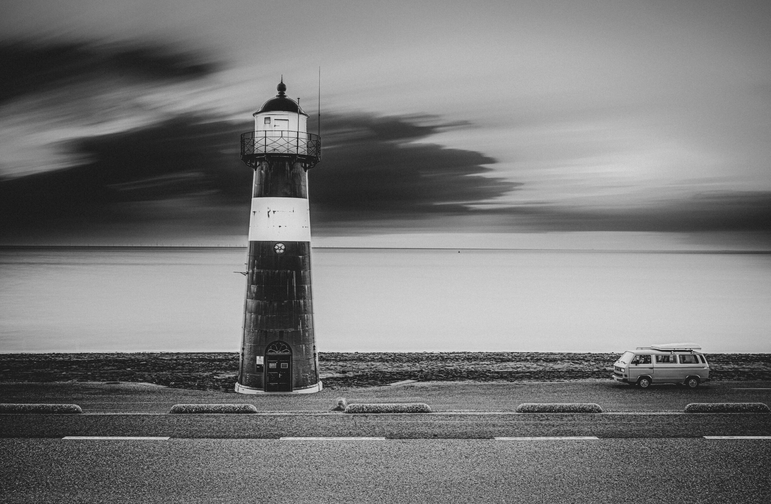 Greyscale Shot Lighthouse Road with Van Side Sea